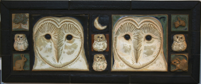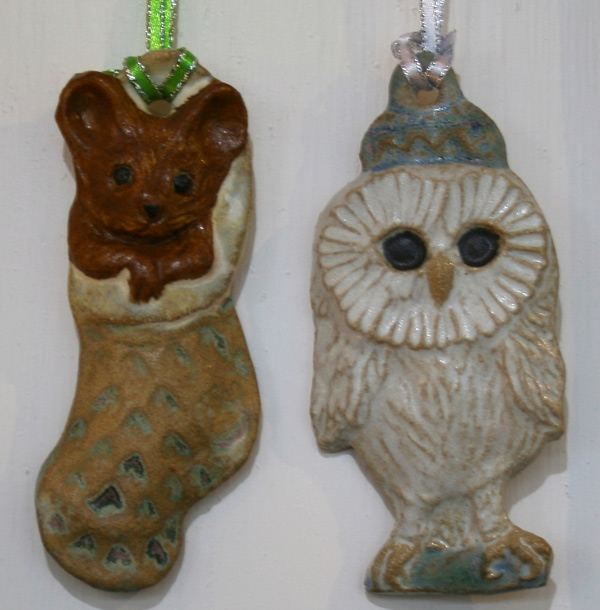 Mary Kuilema brought new work today — and it is wonderful. Ceramic tile collages with owls and rabbits, trees. New Christmas ornaments for the holidays… stop by to see her new work!