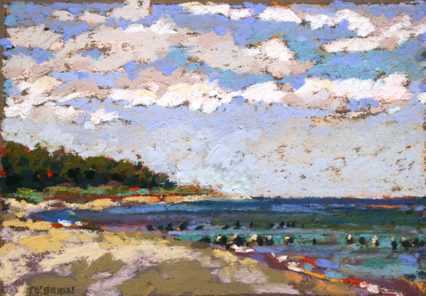 Winter has clearly struck along the Lakeshore: grey skies, Lake effect snow, cold temps. It is a joy to look at Teresa O’Brien’s pastels and imagine the sunny day she did that work! One of my colleagues likes viewing her work because it reminds her of her favorite hobby of walking the beach edge on a fine day.